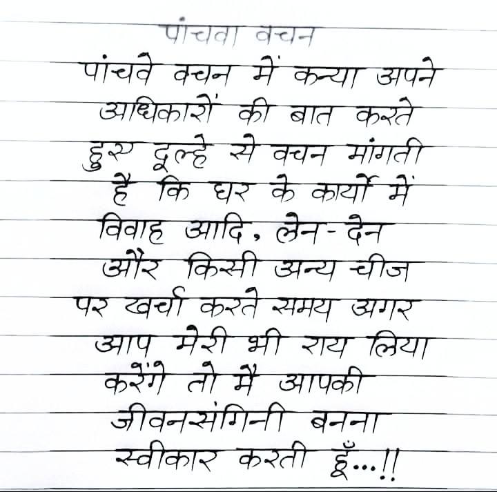 (अंतिम वचन के रूप में कन्या ये वर मांगती है कि आप पराई स्त्रियों को माता के समान समझेंगे और पति-पत्नी के आपसी प्रेम के मध्य अन्य किसी को भागीदार न बनाएंगे। यदि आप यह वचन मुझे दें तो ही मैं आपके वामांग में आना स्वीकार करती हूं।)